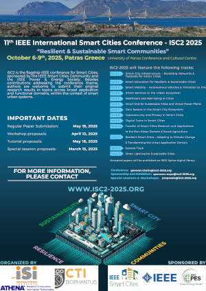 Welcome to 11th IEEE International Smart Cities Conference (ISC2 ), the flagship IEEE conference for Smart Cities, sponsored by the IEEE Smart Cities Community and the IEEE Power & Energy Society. The 11th ISC2 conference will be held at Patras, Greece, organized by the Industrial Systems Institute, Athena RC, and the Computer Technology Institute & Press “Diophantus”.
